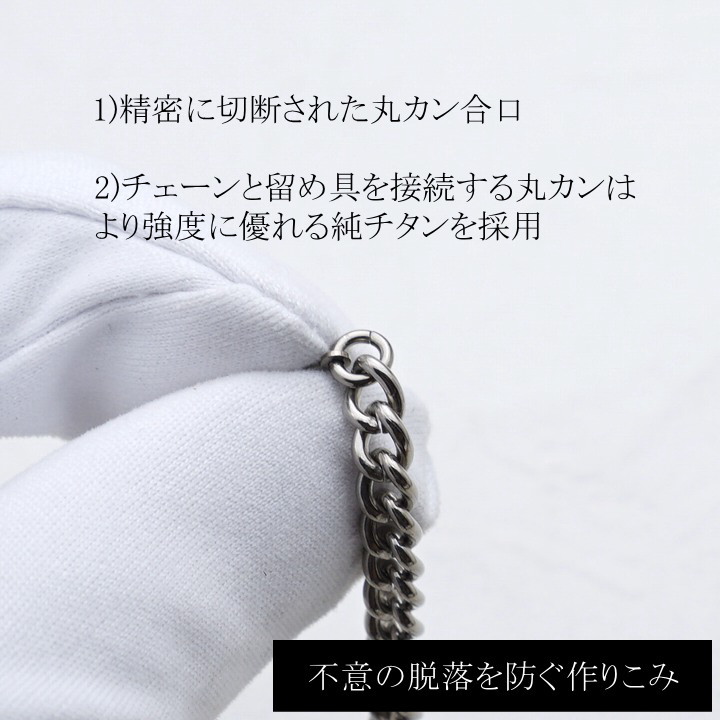 チェーンと留め具をつなぐ丸カンは、より強度に優れたφ1.0mm純チタン2種材を使用。 鋭利な刃物でシャープに切断された合口により切断面をきちんと合わせる事が可能となり、 予期せぬ口開きによるチェーンの脱落を防ぎます。