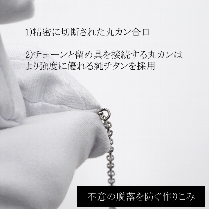 チェーンと留め具をつなぐ丸カンは、より強度に優れたφ0.8mm純チタン2種材を使用。 鋭利な刃物でシャープに切断された合口により切断面をきちんと合わせる事が可能となり、 予期せぬ口開きによるチェーンの脱落を防ぎます。オプションで接続丸カンの溶接施工も可能(+1000円税別)