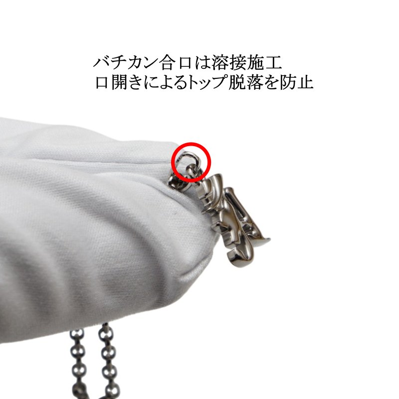 チェーンと留め具をつなぐ丸カンは、より強度に優れたφ0.8mm純チタン2種材を使用。 鋭利な刃物でシャープに切断された合口により切断面をきちんと合わせる事が可能となり、 予期せぬ口開きによるチェーンの脱落を防ぎます。オプションで接続丸カンの溶接施工も可能(+1000円税別)