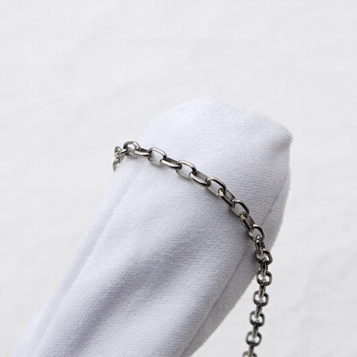 チェーン部の合口はすべて溶接処理されています。少々引っ張っても切れることはありません。スポーツ、激しい運動時の着用にも適しています。