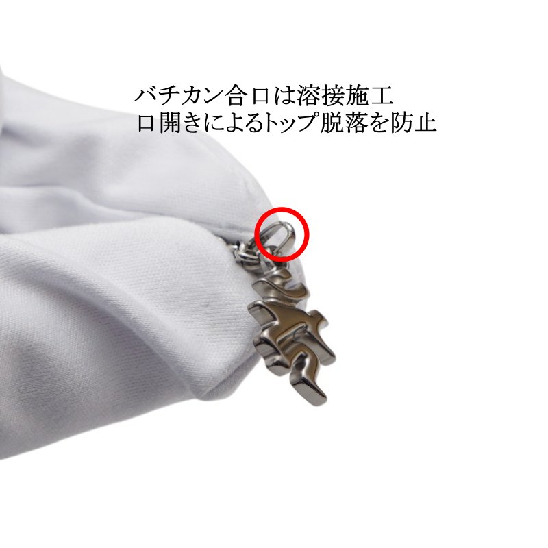 チェーンと留め具をつなぐ丸カンは、より強度に優れたφ0.8mm純チタン2種材を使用。 鋭利な刃物でシャープに切断された合口により切断面をきちんと合わせる事が可能となり、 予期せぬ口開きによるチェーンの脱落を防ぎます。オプションで接続丸カンの溶接施工も可能(+1000円税別)