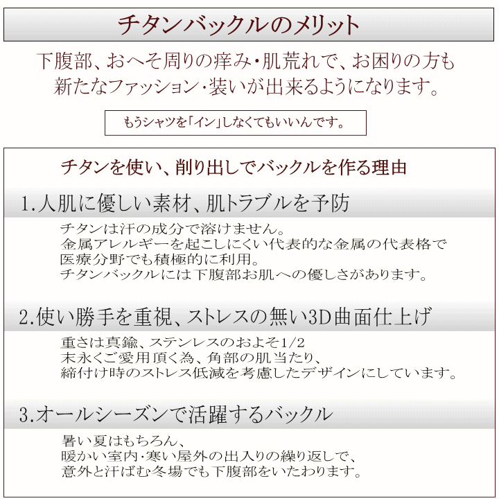 チタンは汗の成分で溶けません。金属アレルギーを起こしにくい代表的な金属の代表格で医療分野でも積極的に利用。チタンバックルには下腹部お肌への優しさがあります。