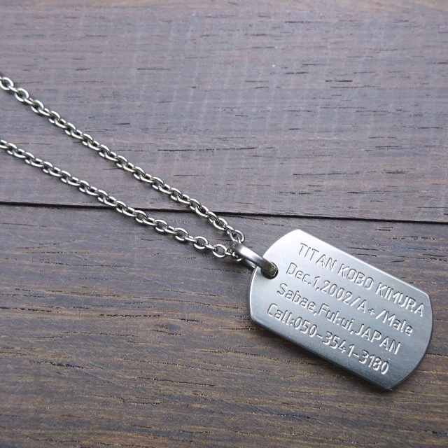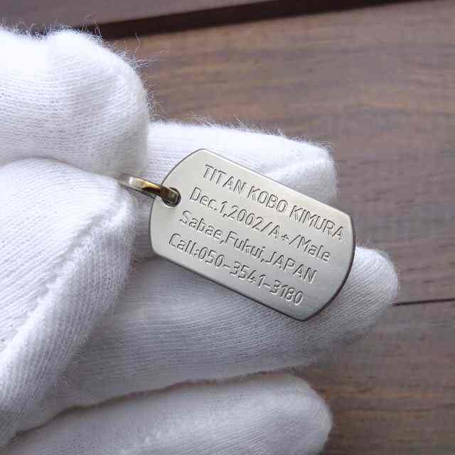 今日届きました!早速着用! 思ってた通りの出来上がりで満足してます! チタンだけありもの凄く軽くて最高です! 外す事がなく肌身離さず持っていられるし、何があってもどんな事があろうと一生忘れない事が出来ます。 色々探してドッグタグにしようと思って探したらチタン工房キムラさんに行き着き、リクエストにも対応してくれて大変満足してますし、 いつかはわかりませんがまた利用したいと思いました!この度は本当にありがとうございました!